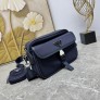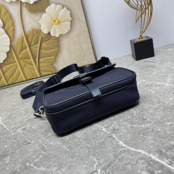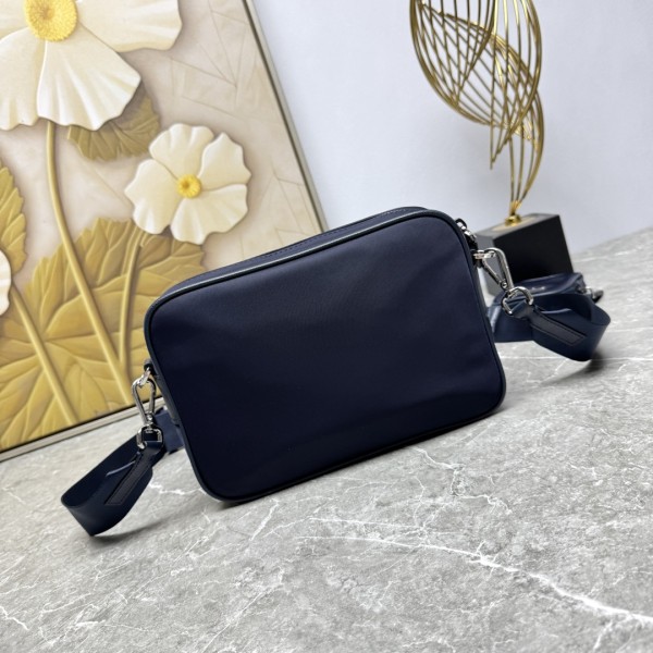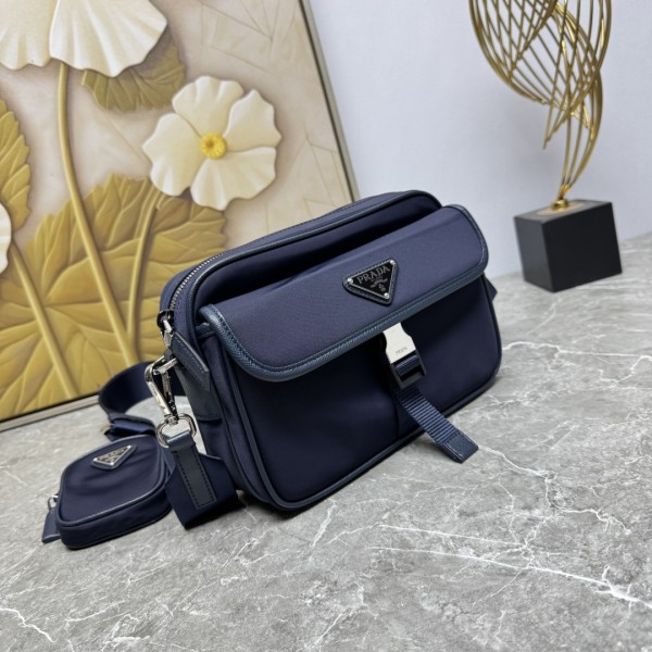 모델번호: 2VH133B / 네이비 고급 수입 나일론 소재 / 에나멜 메탈 삼각 로고 플랩 지퍼 여밈 + 외부 포켓 + 측면 버클 플랩 디자인 탈부착 & 길이 조절 가능한 나일론+가죽 스트랩 미니 파우치 포함 사이즈: 가로 22 x 세로 16 x 폭 5cm ㅡ #가방