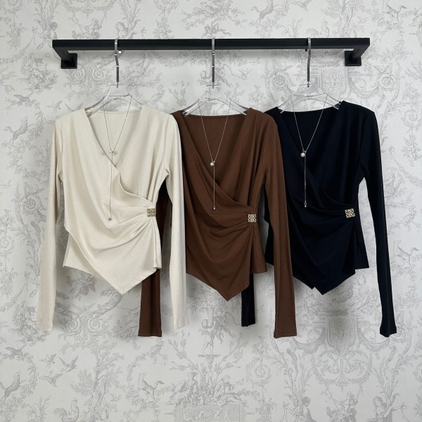 색상: 아이보리 / 블랙 / 브라운 소재: 프리미엄 니트 원단 디자인: 비대칭 셔링, 브이넥, 롱슬리브 사이즈: S / M / L ㅡ #의류