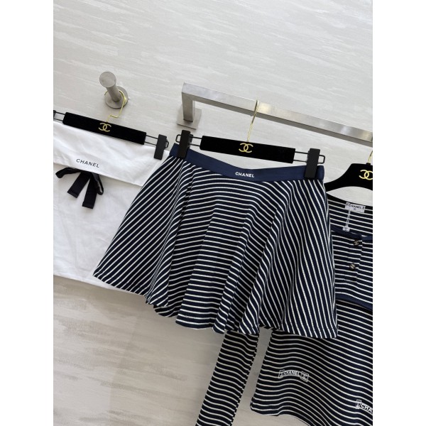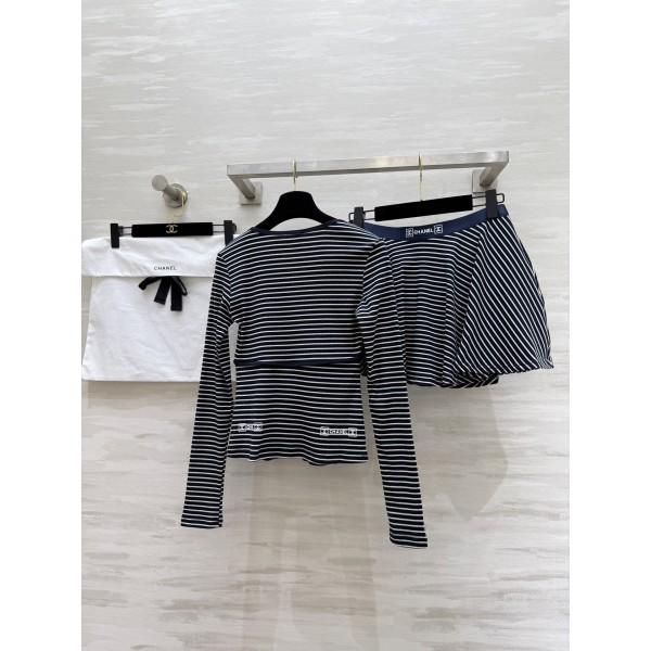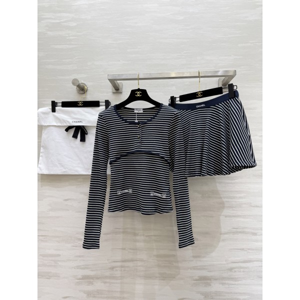 Chanel 샤넬 스트라이프 코튼 세트 긴팔 티셔츠 + 스커트 치마 의류 > 여성 TEE& TOP