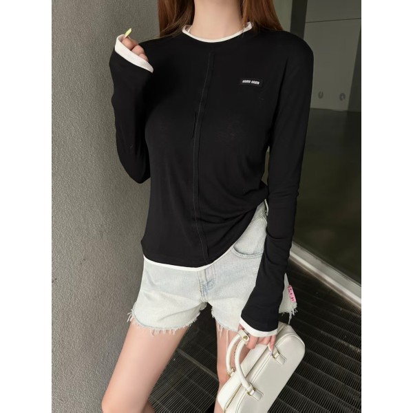 miumiu 미우미우 로고 자수 배색 롱슬리브 긴팔 티셔츠 의류 > 여성 TEE& TOP