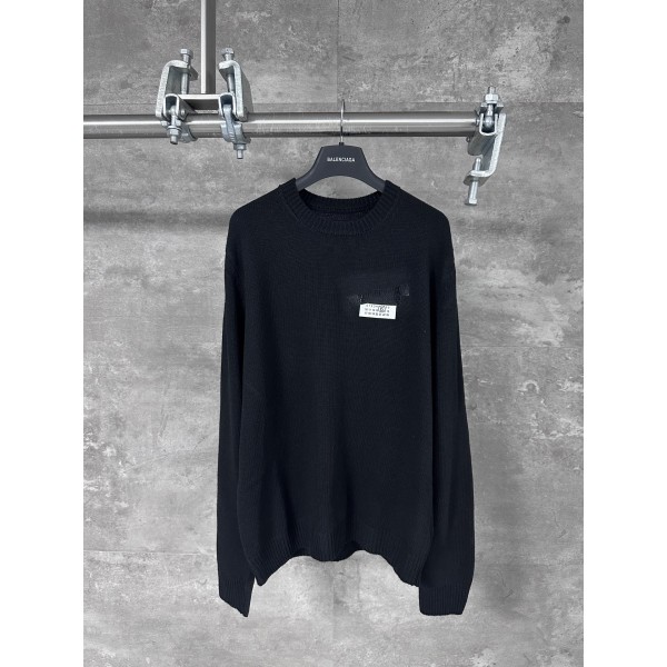 테이프 라벨 울 혼방 니트 스웨터 고밀도 울 혼방사 사용 → 보온성·탄력성·내구성 우수 표면에 은은한 광택과 세련된 질감 표현 가슴 부분에 블랙 테이프 느낌의 입체 PVC 프린트 라벨 디테일 정밀 열압 공정으로 자연스러운 굴곡과 높은 완성도 구현 미완성의 샘플 같은 감성, 마르지엘라 특유의 해체적 디자인 철학을 반영 사이즈: S / M / L ㅡ #의류