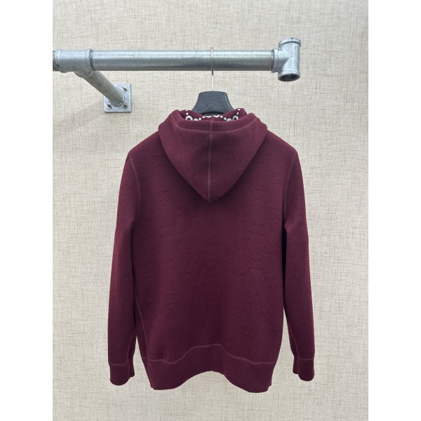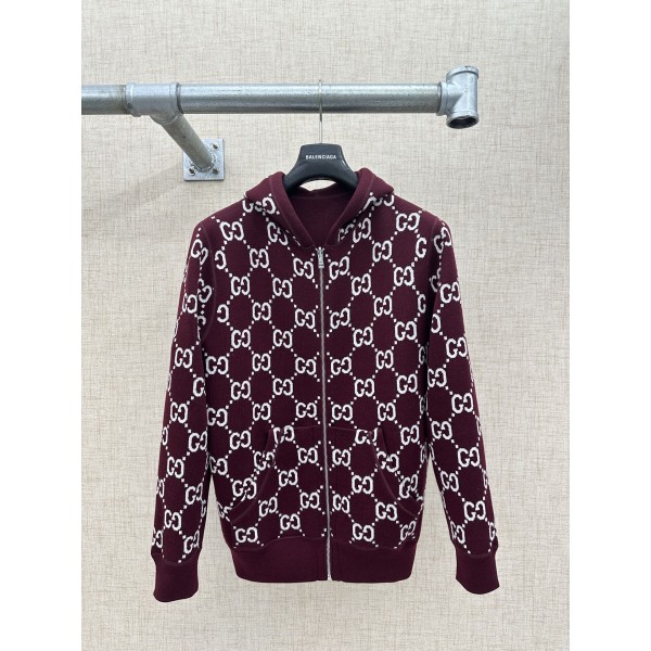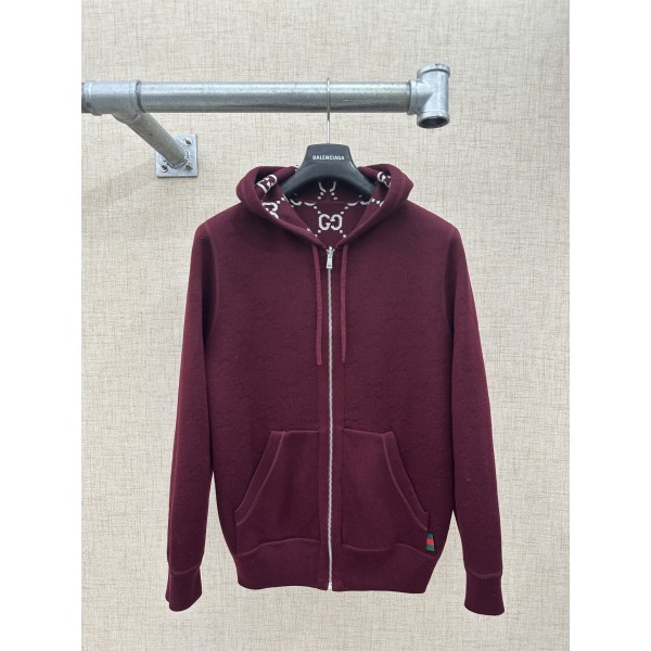 디자인: 양모 소재 양면 착용 디자인 — 한쪽은 버건디 컬러에 화이트 GG 패턴, 다른 한쪽은 솔리드 버건디 스타일: 후드 + 지퍼 여밈으로 캐주얼하면서도 고급스러운 무드 디테일: 섬세한 지퍼 및 스트링 마감, 양면 봉제 완성도 높음 사이즈: S / M / L / XL ㅡ #의류