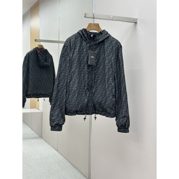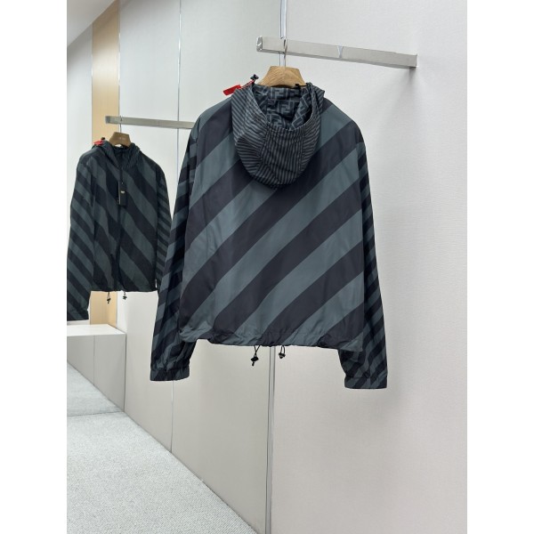 맞춤 밀직 니일론 소재, 부드럽고 편안한 착용감 양면 착용 가능: 한쪽 FF 로고 패턴, 다른 쪽 단색 대각선 Pequin 스트라이프 후드 + 스트링 디테일, 자유로운 스타일링 디지털 직분사 프린트, 레이저 컷팅, 적외선 아일릿 가공 맞춤 Fendi 지퍼·아일릿·조절 버클·라벨 사용 루즈 핏, 사이즈: 48 / 50 / 52 / 54 (S / M / L / XL) ㅡ #의류