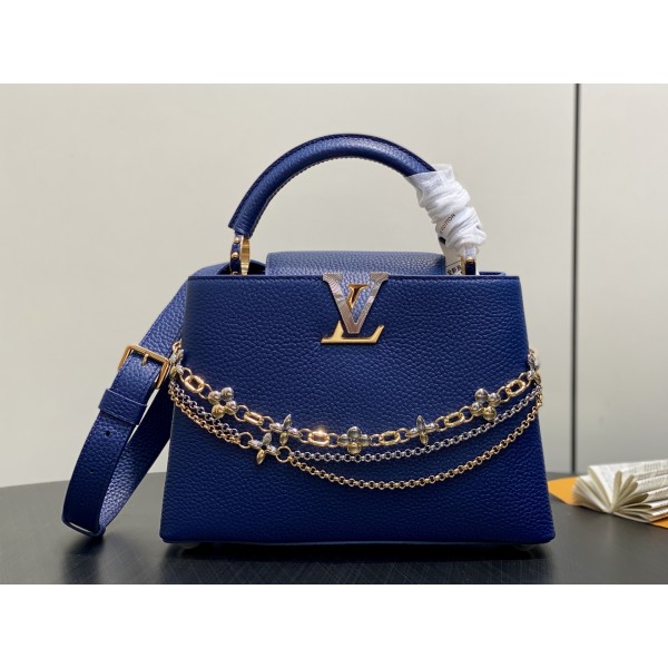 모델명: M27035 색상: 다크 블루 (딥 블루) 소재: 토리용 가죽 (전체 가죽) 디자인: 주얼리 영감 체인 장식, 현대적인 분위기 디테일: 선버스트 효과 LV 로고, 이중 도금 하드웨어 특징: 탈부착 스트랩으로 토트, 숄더, 크로스바디 연출 가능 사이즈: 27 x 17 x 9 cm ㅡ #가방