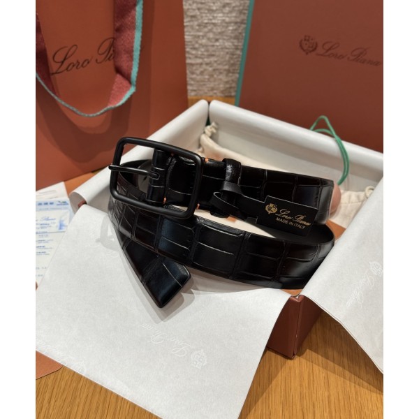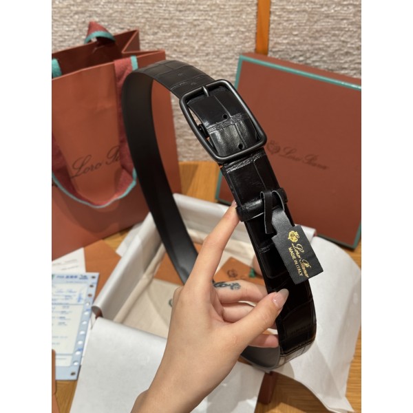 디자인: 깔끔한 라인과 정교한 사각 버클이 조화를 이룹니다. 클래식하면서도 세련된 인상을 주어 격식 있는 차림에 매우 잘 어울립니다. 소재: 최고급 소가죽에 **악어 가죽 패턴**을 정교하게 입혔습니다. 실크처럼 부드러운 매트(무광) 피니시로 마감하여 과하지 않은 고급스러움을 선사합니다. 버클 디테일: 로로피아나 로고가 각인된 팔라듐 도금 금속 사각 버클을 사용하여 은은한 포인트를 주었습니다. 사이즈: 너비 3.5cm ㅡ #벨트