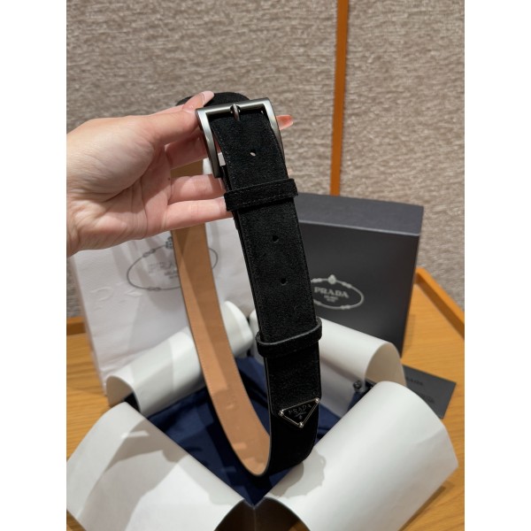 스타일: 심플하면서도 정교함이 느껴지는 절제된 디자인 소재: 고급스러운 질감의 소가죽 스웨이드 소재 디테일: 벨트 끝부분(팁)에 프라다의 상징적인 에나멜 트라이앵글 금속 로고가 장식되어 은은한 포인트 제공 사이즈: 너비 3.5cm ㅡ #벨트