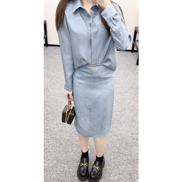 디자인: 우아한 뮤트 블루 컬러에 은은한 더블G 암문 자카드 패턴이 들어간 럭셔리 셋업 소재: 오리지널급(YB) 수입 천연 자카드 실크 (피부에 닿는 부드러운 촉감과 고급스러운 광택) 찰랑거리며 떨어지는 실크 특유의 드레이프성으로 고급스러운 실루엣 연출 셔츠와 스커트 구성으로 세트 착용 시 단아하며, 단품 활용도가 매우 높음 차분한 블루 톤으로 데일리 오피스룩부터 격식 있는 자리까지 완벽 소화 컬러: 블루 (Blue) 사이즈: 36 / 38 / 40 (고버전 프리미엄 라인) ㅡ #의류