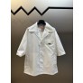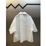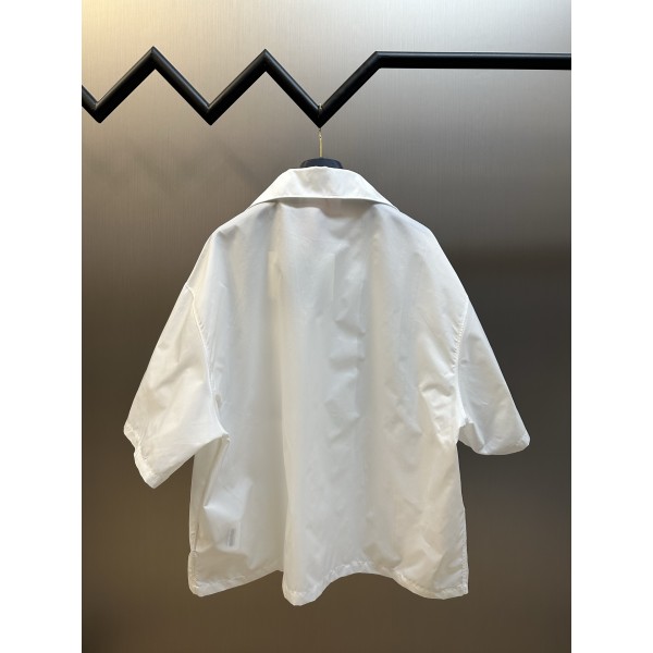 원단: 재생 나일론 원사 디자인: 가슴 전면에 프라다를 상징하는 삼각형 로고를 배치함. 볼링 셔츠 스타일의 칼라 디자인과 정밀한 스냅 버튼 구조를 적용하여 구조적인 인상을 줌 사이즈: S / M / L / XL ㅡ #의류