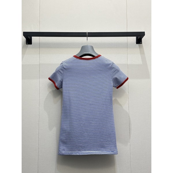 “블루·화이트 스트라이프와 레드 배색 디테일이 돋보이는 반팔 티셔츠” 소재: 고급 코튼 소재로 제작되어 부드럽고 통기성이 좋아 여름철에도 쾌적한 착용감임. 디테일: 블루·화이트 잔 스트라이프 패턴에 레드 컬러 넥라인과 소매 배색이 더해졌으며, 가슴 부분 삼각 로고 디테일로 포인트를 줌. 핏: 바디 라인을 따라 자연스럽게 밀착되는 슬림한 실루엣으로 깔끔하게 떨어지는 핏임. 스타일: 데님, 스커트 등 다양한 하의와 매치해 캐주얼하면서도 트렌디한 스타일 연출이 가능한 아이템임. SIZE: S,M,L ㅡ #의류