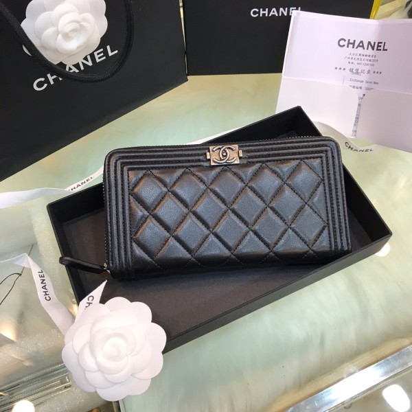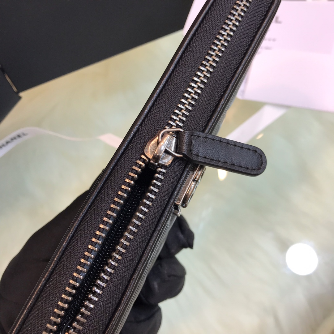 • 샤넬 보이 은장 하드웨어 케비어 가죽 지퍼 중지갑
