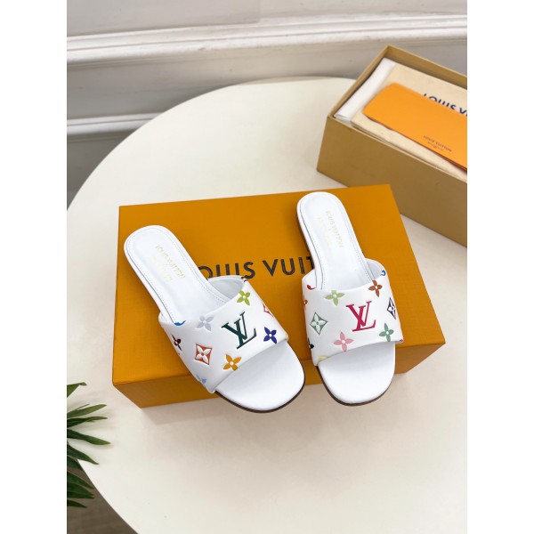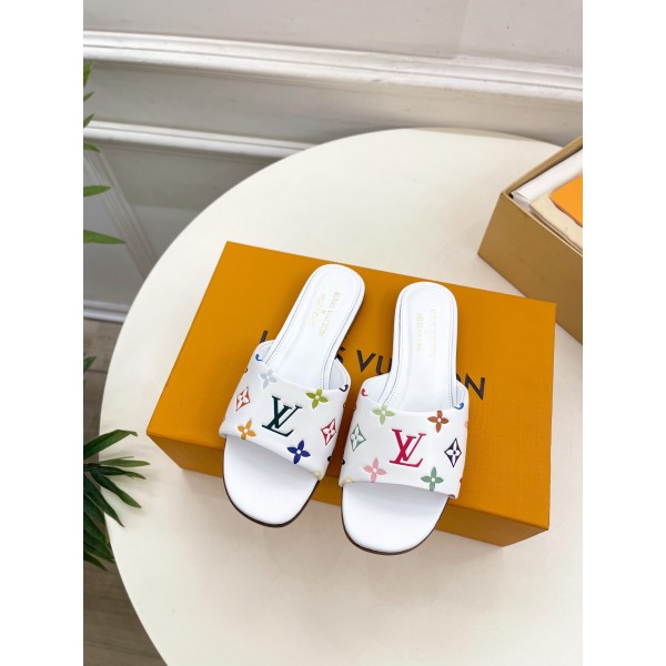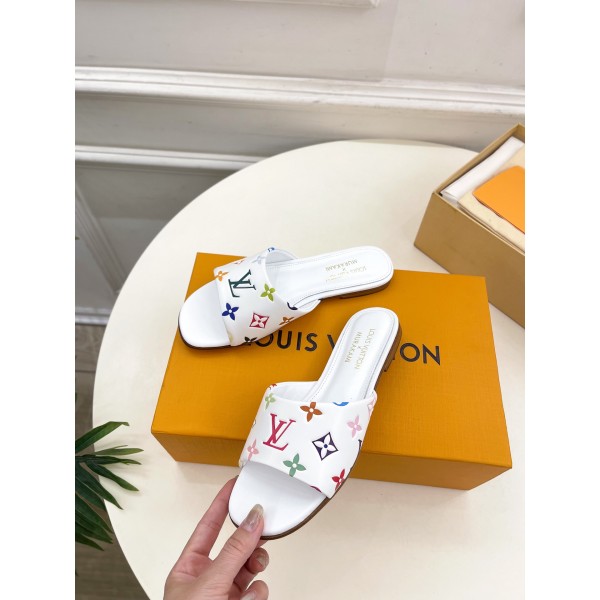 프리미엄 버전 삼색 엠보싱 플랫 슬리퍼 LV X TM 6AM의 무라카미 타카시 콜라보레이션 겉감 : 맞춤 제작 실크 양가죽 안감 : 수입 양가죽 밑창 : 오리지널 이태리 가죽 출 밑창 사이즈 : 34-42 ㅡ #신발