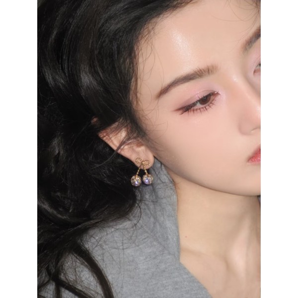 체리 모양 크리스탈 이어링, 귀여운 리본+볼 장식 K골드+크리스탈로 고급스럽고 반짝임 발랄하면서도 우아한 디자인 ㅡ #etc