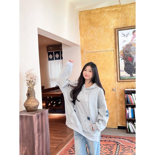 코튼 혼방 소재로 편안하고 보온성 좋음. 데미지 + 레이스 믹스 디자인으로 레이어드 감각 강조. 루즈핏의 캐주얼한 스트리트 무드, 전면 포켓 실용적. 그레이 톤으로 블랙·그레이 하의와 매치 쉬움. 프리사이즈 ㅡ #의류
