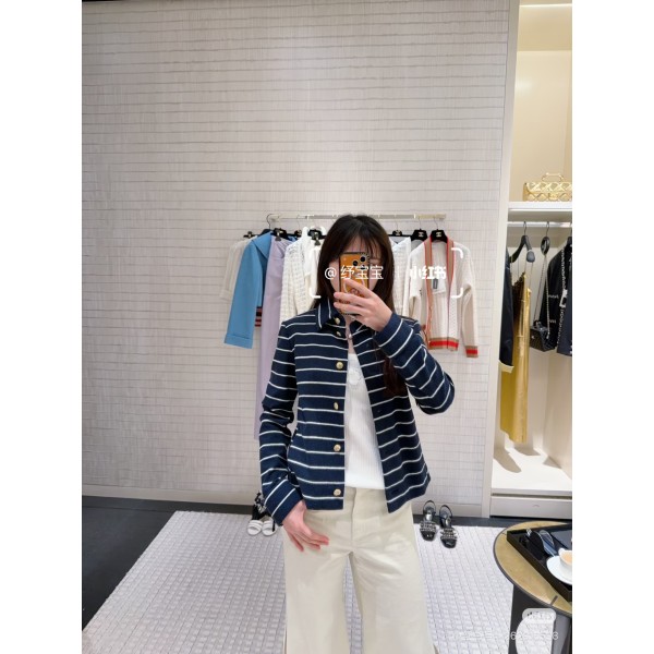 디자인: 세련된 네이비 배색 스트라이프 패턴 핏: 몸매가 슬림해 보이는 완벽한 실루엣 특징: 어떤 코디에도 잘 어울리는 범용성, 착용 시 얼굴이 살아나는 화사한 색감 사이즈: 36, 38, 40 ㅡ #의류