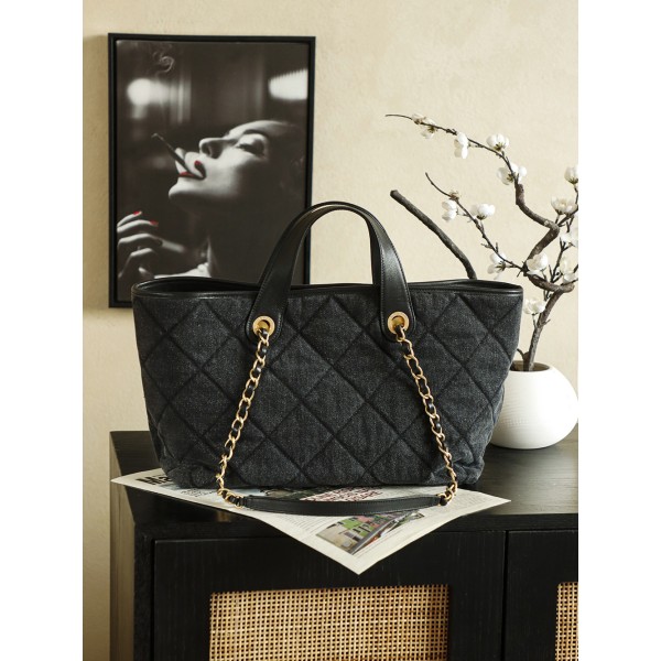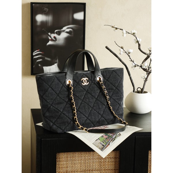 특징: 클래식한 다이아몬드 퀼팅 디자인에 내구성이 뛰어난 데님(Denim)과 가죽을 믹스매치하여 캐주얼하면서도 우아한 무드 완성 포인트: 정면에 위치한 골드 더블 C 로고가 확실한 브랜드 존재감을 드러내며, 데님 소재 특유의 내구성으로 관리가 용이함 활용: 넉넉한 사이즈와 편리한 개폐 구조로 **데일리 출퇴근(Commuting)**은 물론, 비치백이나 단거리 여행용으로도 최적화된 높은 실용성 사이즈: 26 * 44 * 13 cm ㅡ #가방