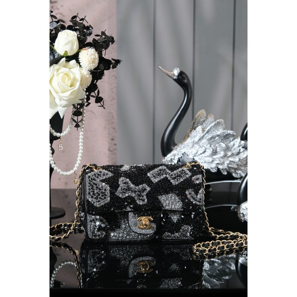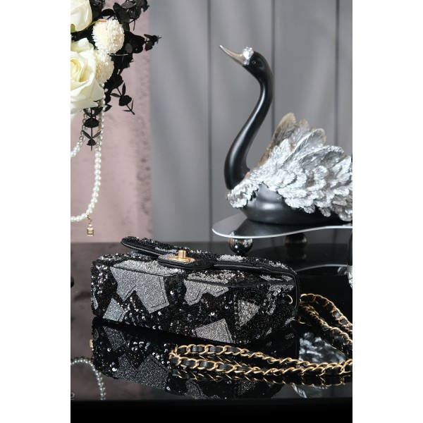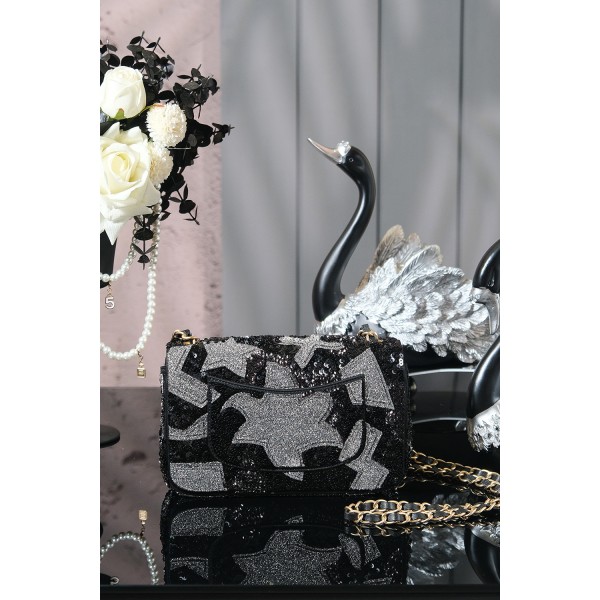 특징: 샤넬 25p 수공예 공방 컬렉션의 정수로, 정교한 밀도 높은 시퀸 자수가 돋보이는 리미티드 모델 디자인: 클래식 플랩(CF) 쉐입에 블랙 'SO BLACK' 감성과 화려한 꽃무늬 시퀸 믹스가 더해진 독보적 아우라 포인트: 빛에 따라 입체적으로 반짝이는 비즈 디테일과 'SO BLACK' 하드웨어의 시크한 조화 활용도: 압도적인 화려함으로 파티, 만찬 등 특별한 자리는 물론 트렌디한 '착장'의 포인트로 소장 가치 충분 사이즈: 20 cm (스몰) ㅡ #가방