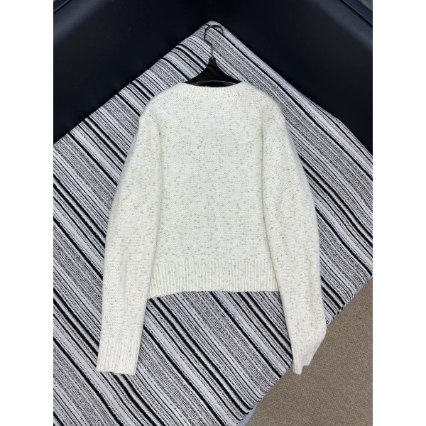 소재: 미세한 펄감이 느껴지는 글리터 혼방 사선을 사용하여 움직일 때마다 은은하게 빛나는 광택이 특징입니다. 부드럽고 쫀득한 니트 소재로 피부에 자극 없이 따뜻하게 착용 가능합니다. 디자인: 아이코닉한 입체 리본 장식이 옷 전체에 포인트로 들어가 미우미우 특유의 러블리한 감성을 극대화했으며, 가슴 부분의 정교한 로고 자수가 고급스러움을 더합니다. 무드: 입는 순간 얼굴이 환해 보이는 '톤업' 효과와 함께 사랑스러운 **소녀 무드**를 연출해주며, 블랙과 화이트의 기본 컬러 구성으로 활용도가 매우 높습니다. 컬러: 블랙, 화이트 사이즈: S, M, L ㅡ #의류
