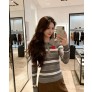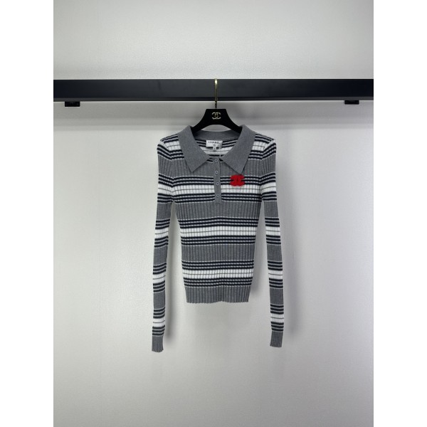 Chanel 샤넬 그레이 스트라이프 레드 플라워 카라 긴팔 니트 의류 > 여성 TEE& TOP
