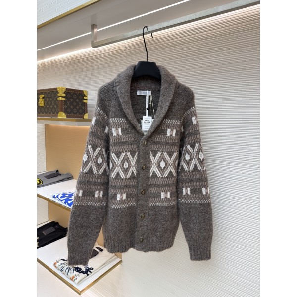 “기하학 자카드 패턴과 숄 칼라 디자인으로 완성한 브루넬로 쿠치넬리의 클래식 니트 가디건” 소재: 알파카 혼방 울 니트 원사 사용으로 부드럽고 포근한 촉감과 우수한 보온성·통기성 제공 디테일: 다크 브라운 컬러 베이스에 아이보리 톤 기하학 자카드 패턴 적용, 컴퓨터 편직 공정으로 패턴의 입체감과 정교함 구현 스타일: 숄 칼라 구조와 천연 혼 버튼 디테일로 단정하면서도 고급스러운 무드 연출, 캐주얼부터 클래식 룩까지 폭넓게 활용 가능 SIZE: S, M, L ㅡ #의류