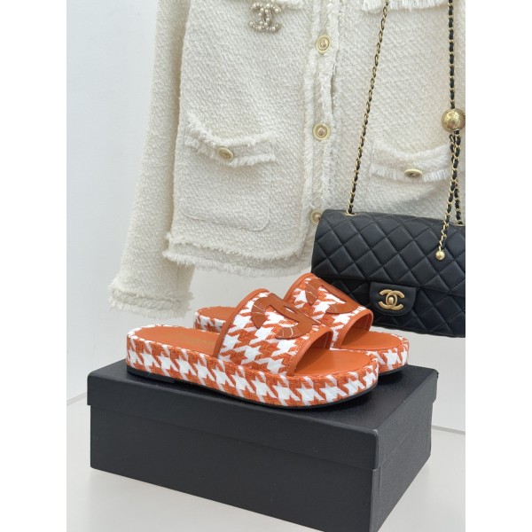 "샤넬로고와 하운드투스 패턴이 포인트인 플랫폼 슬리퍼" 소재: 커스텀 소재 갑피, 양가죽 안감 및 인솔, 커스텀 미끄럼방지 아웃솔 디테일: 배색 톱니 패턴 하운드투스 디자인, 입체 대형 로고, 3cm 플랫폼 사이즈: 35,36,37,38,39,40,41 ㅡ #신발