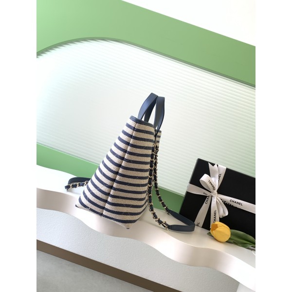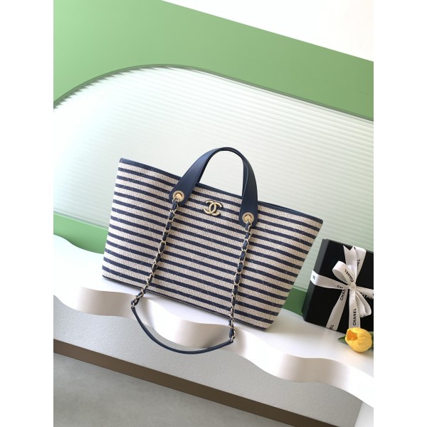 모델: 26C (크루즈) 컬렉션 (AS6007) 디자인: 블루 & 화이트 스트라이프 + 네이비 가죽 핸들 소재: 경량 캔버스(패브릭) + 가죽 트리밍 스트랩: 가죽 핸들 + 금속 체인 (토트/숄더 겸용) 특징: 전면 더블C 로고, 시원한 마린룩/리조트룩 감성 활용: 여름 데일리백 및 여행용 (넉넉한 수납력) 사이즈: 25 × 46 × 13 (cm) ㅡ #가방