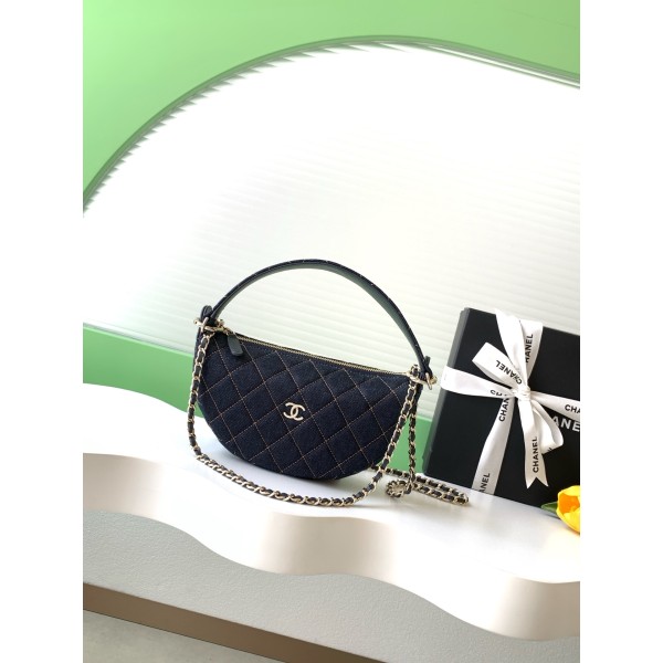 시즌: 26P 시즌 한정 컬렉션 품번: AP5094 소재: 다크 블루 데님(다님) + 골드 금속 하드웨어 사이즈: 15 × 22 × 6 (cm) 디자인: 트렌디한 호보(반달) 쉐입 + 클래식 다이아몬드 퀼팅 정면 금속 더블C 로고 포인트 스트랩: 가죽 꼬임 체인 스트랩 (숄더/크로스백 연출) 수납: 휴대폰, 지갑 등 데일리 소지품 수납에 최적화된 내부 특징: 가벼운 데님 소재로 내구성이 좋으며, 봄/여름 시즌에 어울리는 청량한 무드 ㅡ #가방