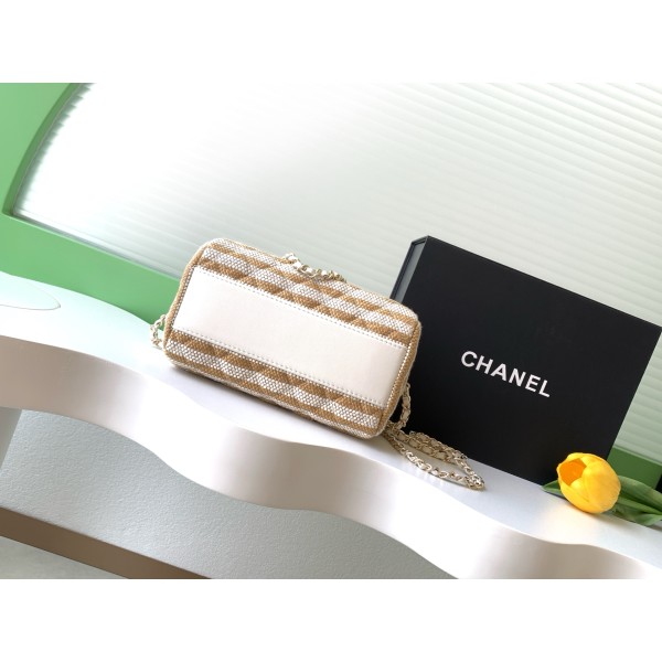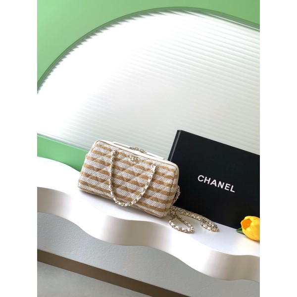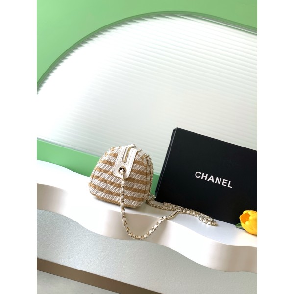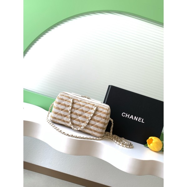 모델명: AP4986 (26C 크루즈 컬렉션) 디자인: 청량한 흑백 스트라이프 패턴 & 아이코닉 더블 C 로고 소재: 가볍고 시원한 천연 초직(Straw/Raffia) 소재 사이즈: 18.5 × 11.5 × 11 cm 활용: 귀여운 보울링백 쉐입으로 핸드백이나 크로스백 모두 가능해요. 장점: 여름 휴양지 분위기가 물씬 풍기며, 금속 체인이 더해져 고급스러워요. 관리: 물과 오염에 약하니 비 오는 날은 피해주시고 살살 닦아 관리해 주세요! ㅡ #가방