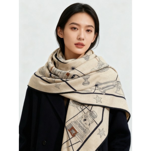 “별 모티프 패턴이 돋보이는 대형 캐시미어 실크 스카프” 소재: 캐시미어 70%, 실크 30% 혼방 원단. 디테일: ‘별의 합창’ 테마 그래픽 프린트, 수작업 롤 엣지 마감. 사이즈: 140 × 140 cm ㅡ #스카프