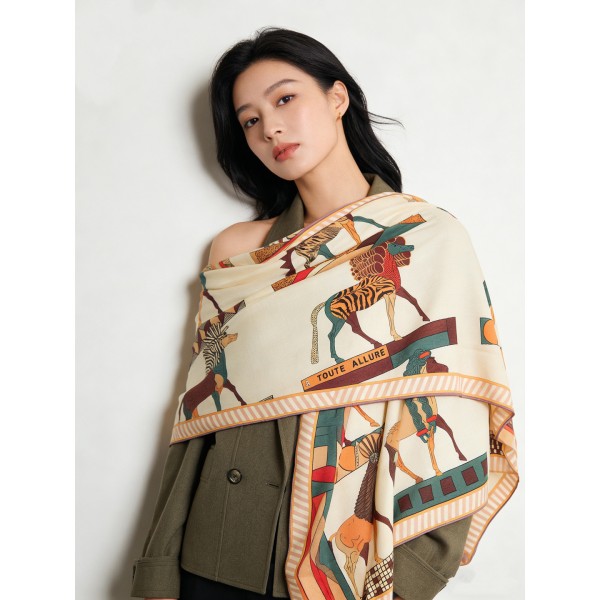 “역동적인 그래픽이 돋보이는 대형 캐시미어 실크 스카프” 소재: 캐시미어 70%, 실크 30% 혼방 원단. 디테일: ‘Full Speed’ 테마 그래픽 프린트, 수작업 롤 엣지 마감, 양면 동일 컬러 디자인. 사이즈: 135 × 135 cm ㅡ #머플러
