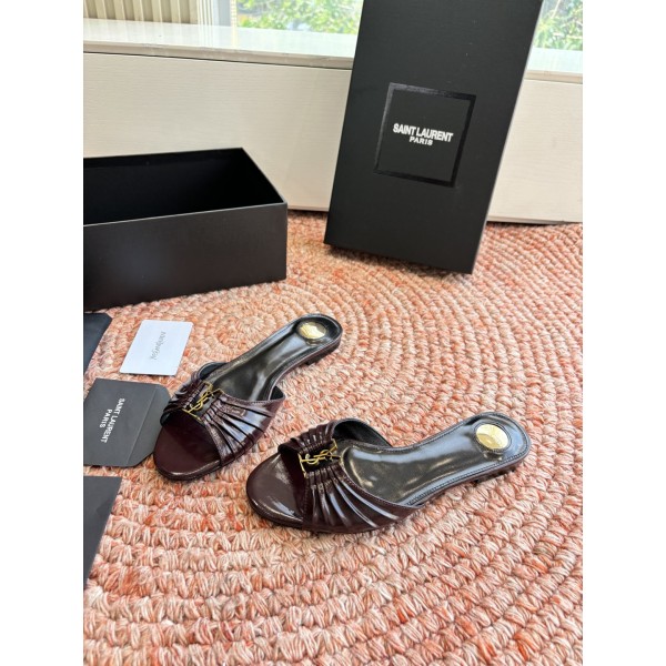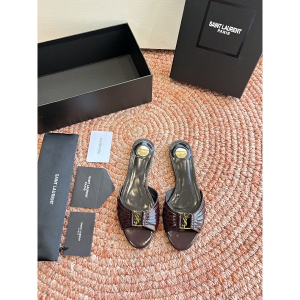 "셔링 디테일과 YSL 로고 장식이 돋보이는 페미닌 힐 슬리퍼" 소재: 천연가죽 어퍼 / 가죽 인솔 / 가죽 아웃솔 디테일: YSL 로고 메탈 장식, 셔링 가죽 스트랩, 오픈토 디자인 스타일: 발 라인을 자연스럽게 보정해주는 페미닌·럭셔리 스타일 SIZE: 35,36,37,38,39,40,41,42 ㅡ #신발