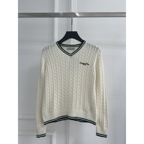 "배색 스트라이프와 로고 자수가 적용된 브이넥 니트" 소재: 코튼 + 울 혼방 니트 원단으로 제작되어 부드럽고 포근한 착용감 디테일: 케이블 니트 조직, 배색 스트라이프 트림, 가슴 Christian Dior Paris 로고 자수, 리브 마감 핏: 바디라인에 맞게 떨어지는 슬림핏 스타일: 단독 또는 레이어드로 활용 가능한 클래식 니트 아이템 SIZE: S,M,L ㅡ #의류