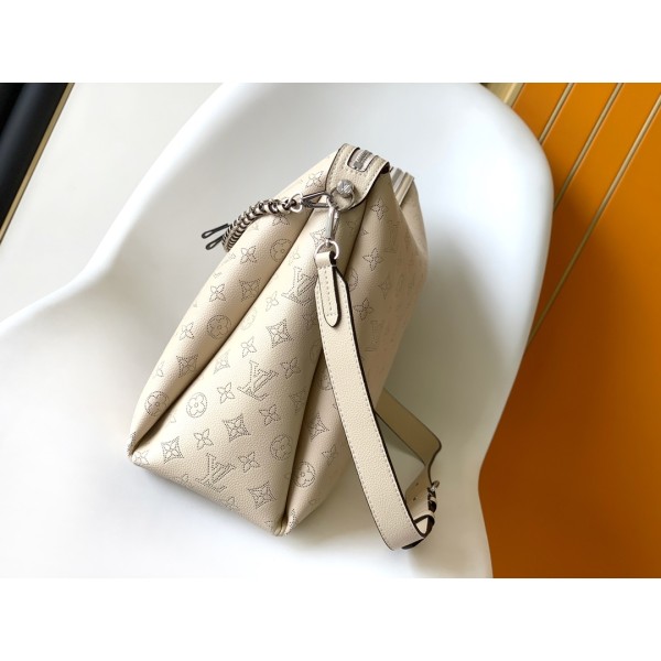 M24131 연베이지 Mahina Hand It All 중형 숄더백 고급 송아지 가죽 소재, 섬세한 펀칭 디테일 탈부착 가능한 체인 & 가죽 꼬임 핸들 스트랩: 탈착 불가, 길이 조절 가능 (40~53cm) 체인 길이: 34cm (탈착 가능) 크기: 32 x 29 x 13cm ㅡ #가방