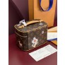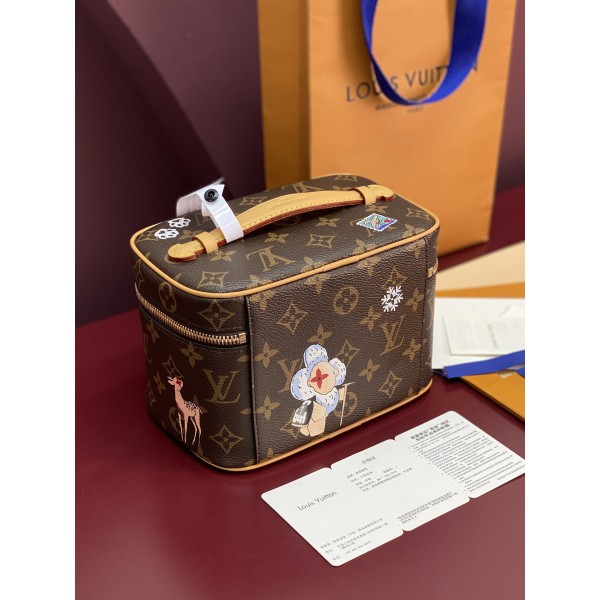 Nice 미니 파우치 Monogram 캔버스, 둥근 박스형 디자인 가죽 핸들 및 더블 지퍼 여밈 Vivienne 캐릭터 겨울 여행 테마 프린트 세탁 가능한 밝은 안감 사이즈: 13.5 × 12 × 20cm ㅡ #가방
