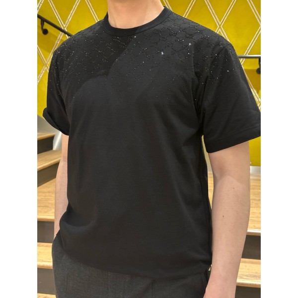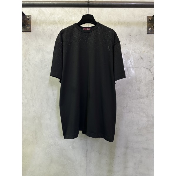 디자인: SS26 신상, 크리스탈급 **핫픽스(스톤)**를 사용한 그라데이션 더블G 로고 디자인 소재: 32수 코마사 이중사 코튼 (매끄럽고 탄탄한 촉감) 넥라인: 1*1 소로나(Sorona) 시보리 적용 (복원력 우수, 늘어남 방지) 특징: 오리지널 1:1 도안 기반, 시각적 충격이 있는 화려한 핫픽스 디테일, 남녀공용 컬러: 블랙 사이즈: S / M / L / XL ㅡ #의류