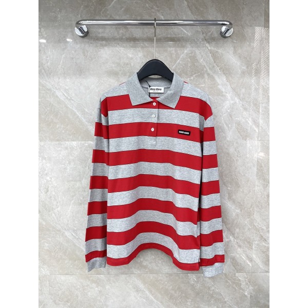miumiu 미우미우 컨트라스트 로고 패치 스트라이프 긴팔 티셔츠 의류 > 여성 TEE& TOP