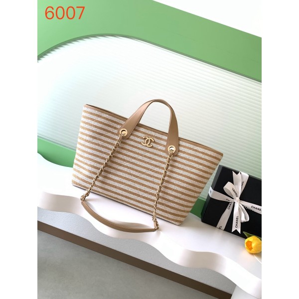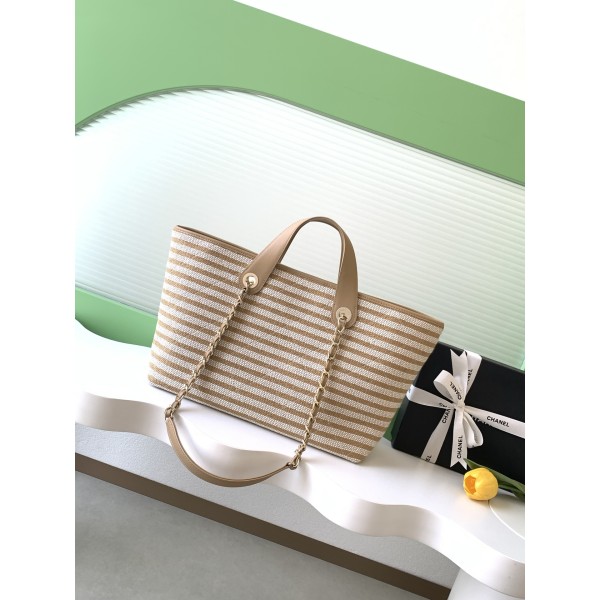 모델: 26C (크루즈) 컬렉션 (AS6007) 디자인: 브라운 & 베이지 스트라이프 + 브라운 가죽 핸들 사이즈: 25 × 46 × 13 (cm) 소재: 경량 캔버스(패브릭) + 가죽 트리밍 스트랩: 가죽 핸들 + 금속 체인 (토트/숄더 겸용) 특징: 전면 더블C 로고, 내추럴하고 우아한 무드 활용: 여름 데일리백 및 휴양지 리조트룩 최적 ㅡ #가방